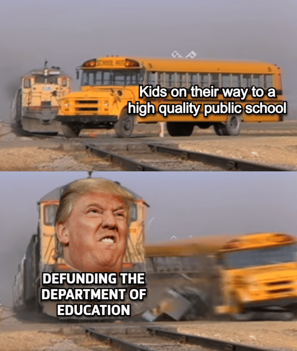 Why It Matters: Without the Department of Education, all public school students will struggle to learn, thrive, and advance their learning, especially those most vulnerable. Quality education should be a basic human right, but according to the Trump administration, it should only be offered to those who can afford it. We are already facing a teacher shortage and seeing literacy rates decline, and surprisingly, the answer to this problem is not shutting down the department meant to fix it. The State, Interior, and Labor Departments are not equipped to handle the education roles, leaving students and teachers without needed support. Cuts to the federal government have real consequences, yet Trump doesn’t care—his only priorities are money and control, not the people he was elected to serve.